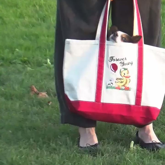 Forever Young design embroidered directly onto tote, in addition to embroidered accent on other side, located above external pocket.